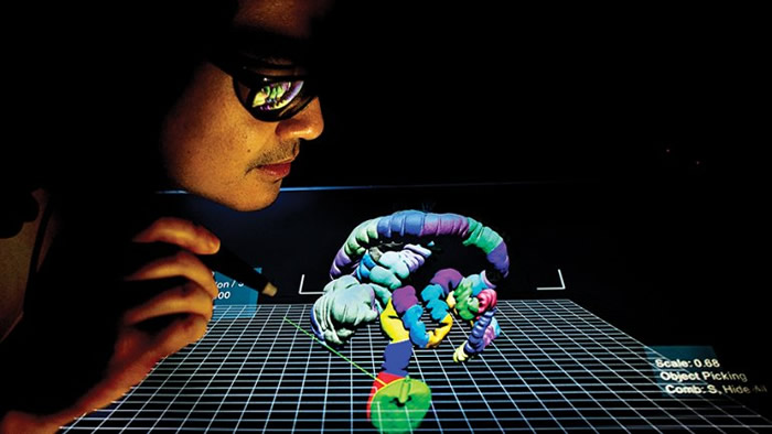 As she moves, a computer monitor with stereoscopic optical technology tracks her glasses, which have different polarisation in each lens, prompting her brain to construct a virtual holographic object that recreates the size and shape of the human anatomy.