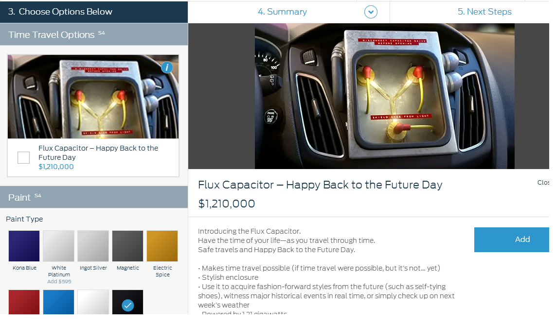 untitledBetween October 21 and 26, Ford purchasers can “time travel” on the company’s website. Ford is making its flux capacitor, powered by 1.21 gigawatts available for $1.21 million as a factory option for 2016 Ford Focus and Fiesta buyers.