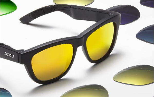 Sunglasses with built-in bone conduction speakers transmit sound to your skull