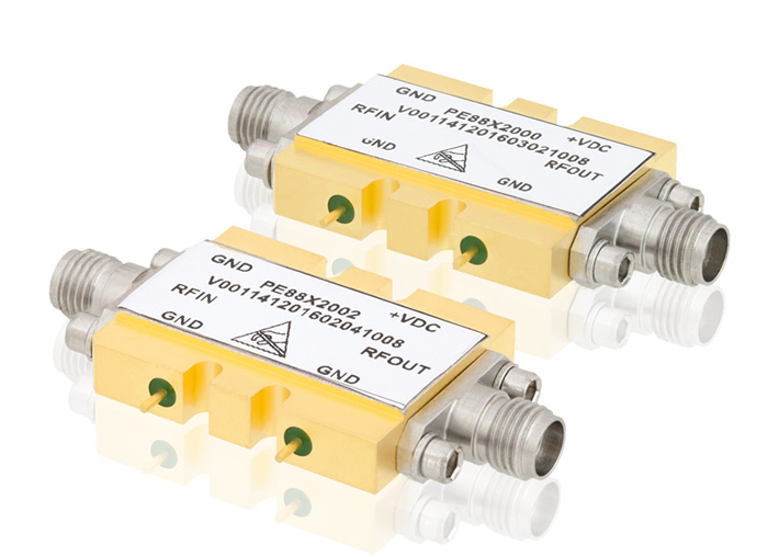 The PE88X-series active frequency (x2) multipliers double input frequencies ranging from 4 GHz to 23 GHz up to desirable mm-wave output frequencies from 8-46 GHz. These new designs use highly efficient GaAs PHEMT semiconductor technology with integrated amplifiers that produce high output power levels up to +17dBm with excellent fundamental and harmonic suppression. This can eliminate the need for an external LO buffer amplifier stage and additional support circuitry.