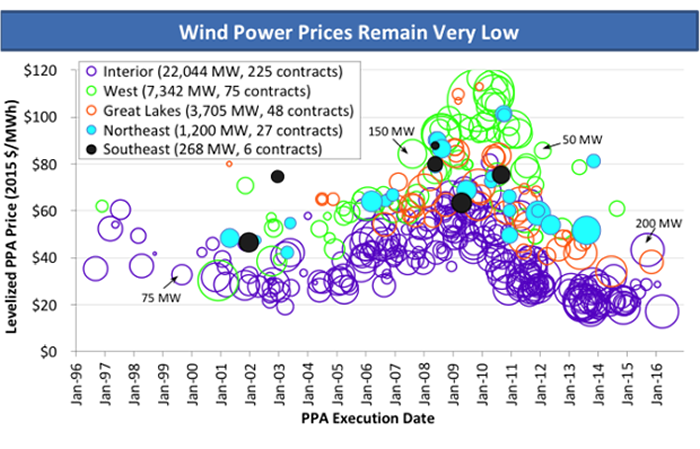 “Wind energy prices—particularly in the central United States—are at rock-bottom levels, with utilities and corporate buyers selecting wind as the low-cost option,” said Berkeley Lab Senior Scientist Ryan Wiser. “Moreover, enabled by technology advancements, wind projects are economically viable in a growing number of locations throughout the United States.”