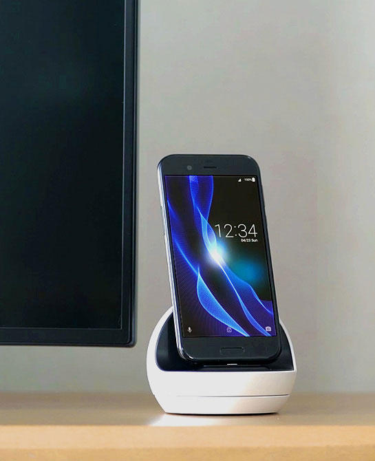 Aquos R phone charging base faces you through a call