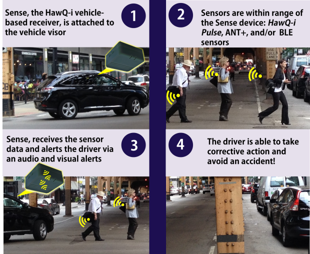 The HawQ-i Sense & Avoid Life-Saving Sensor-Based Collision Avoidance Technology is the world’s first sensor-based tech that alerts drivers when there are bicycles, motorcycles, and pedestrians on or near the road. HawQ-i employs a low-power transceiver that provides audio and visual alerts for the driver when a personal sensor is detected within range of the vehicle.