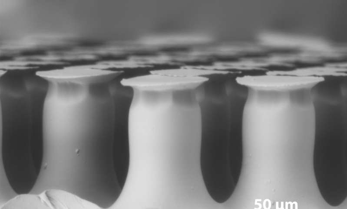 The adhesive is a three-layer tape—on top are mushroom-shaped pillars with sticky flat tops that actually touch the surface of the target material, i.e., glass. The pillars are embedded in a layer of polydimethylsiloxane, which is in turn connected to a layer of azobenzene liquid crystals. At the bottom, there is another layer of polydimethylsiloxane. The adhesive works because the azobenzene crystals are sensitive to UV light—they change position relative to one another when a UV light is aimed at them. The upper material allows the adhesive to stick to a glass surface, but only when it is aligned properly, which happens in the absence of UV light. Aiming a UV light at the adhesive causes it to curl slightly pulling the sticky parts from the glass surface, allowing the adhesive to release. Varying the amounts of UV light applied allows for tuning the degree of adherence required.
