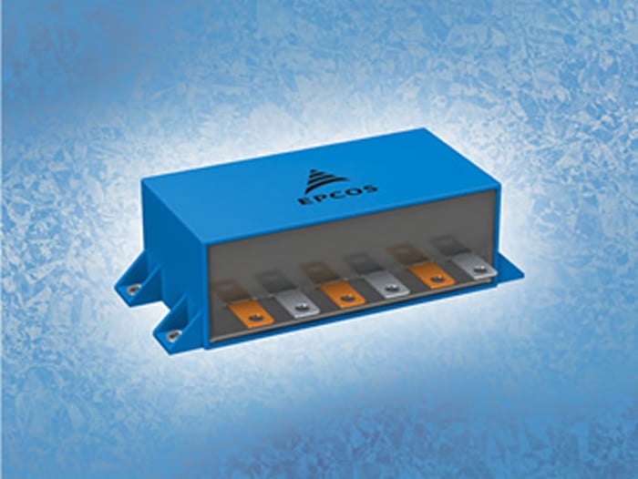 Specifically designed for the HybridPACK 1-DC6 IGBT module from Infineon Technologies, TDK Corporation has presented an EPCOS DC link capacitor. The outstanding features of this component are the six busbar terminals with dimensions that are matched precisely to fit the IGBT module. This multiple contacting produces an excellent current capability while at the same time offering very low parasitics.