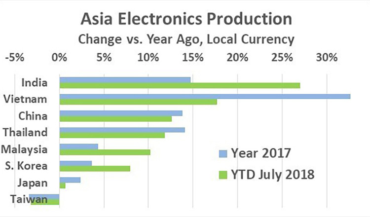 Electronics production change in key Asian countries has been mixed. India and Vietnam have led the way, with India’s electronics growth accelerating from 15% in 2017 to 27% year-to-date through July 2018. Vietnam has decelerated from 33% growth in 2017 to a still robust 18% year-to-date. India and Vietnam should continue to outperform other Asian countries because of their low labor rates and improving infrastructures. China and Thailand have maintained growth in the 12% to 14% range over the last year and a half. Malaysia and South Korea have picked up from four percent in 2017 to ten and eight percent respectively year to date. Japan electronics growth is stuck in the low single-digits while Taiwan has seen declines.