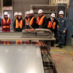 DARPA MENTOR2 performers observe current industrial-scale laser cutting at Norfolk area industrial Ship Yards. The Fab Lab installation at the Mid-Atlantic Regional Maintenance Center will include a smaller laser cutter and other prototyping equipment. Navy personnel will be able to train on the Fab Lab equipment to gain insight into the operation of larger equipment while fabricating creative solutions to maintenance problems.