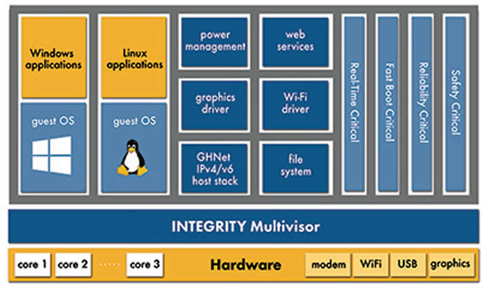 Today, global automotive carmakers and their Tier 1 suppliers in North America, Europe and Asia have adopted INTEGRITY and INTEGRITY Multivisor as a common virtualization platform on which to tame software complexity and reduce the number of electronic control units (ECUs). The certified INTEGRITY separation kernel architecture is the trusted foundation enabling guest operating systems such as Linux and Android to run safely alongside other functions requiring certified safety and security such as digital instrument clusters and integrated cockpits, connected car, and advanced driver assist systems (ADAS).