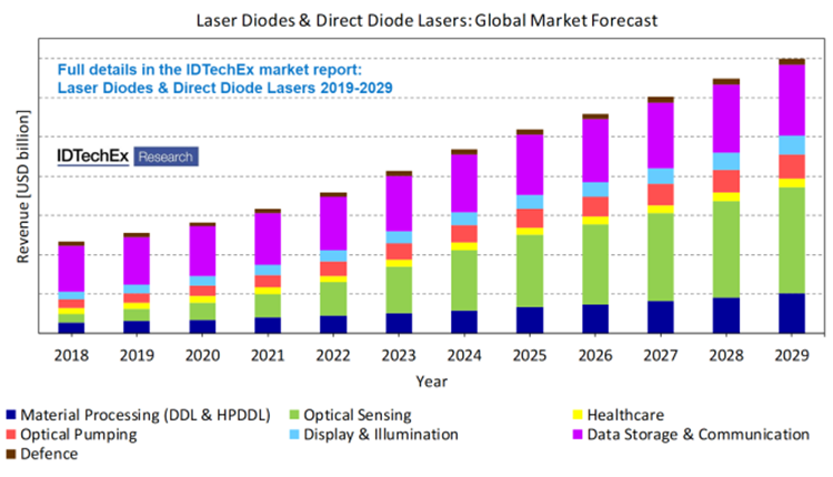 In the recent report titled ‘Laser Diodes & Direct Diode Lasers 2019-2029: Technologies, Markets & Forecasts’, IDTechEx analyst Dr Nilushi Wijeyasinghe explores how advances in laser diode technologies affect the growth of market segments outlined above.