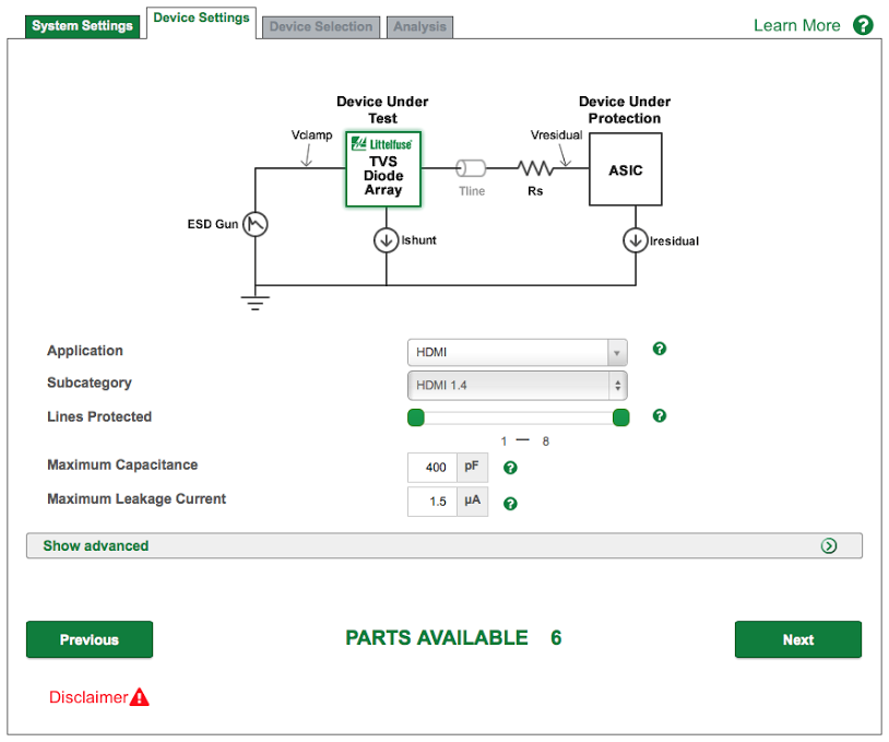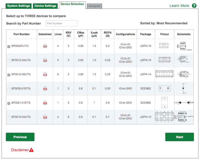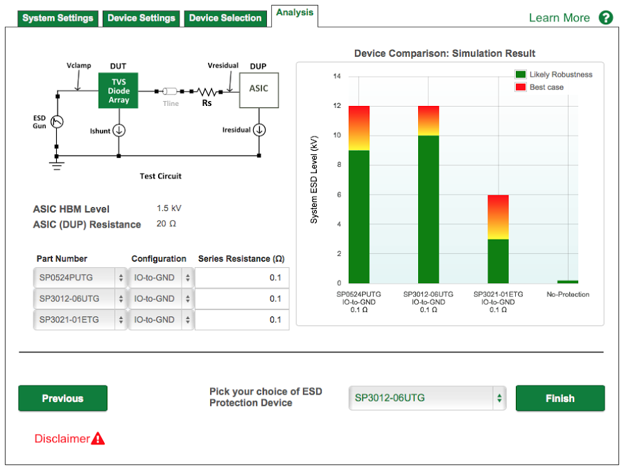 Users of the ESD selection tool can enter parameters on the System Settings and Device Settings pages, then select from up to three devices to compare on the Device Selection page. An Analysis page allows running simulations that compare the system ESD levels of the selected devices, quickly identifying which one can offer the most robust performance for the application, as well as each device’s “best case” performance.