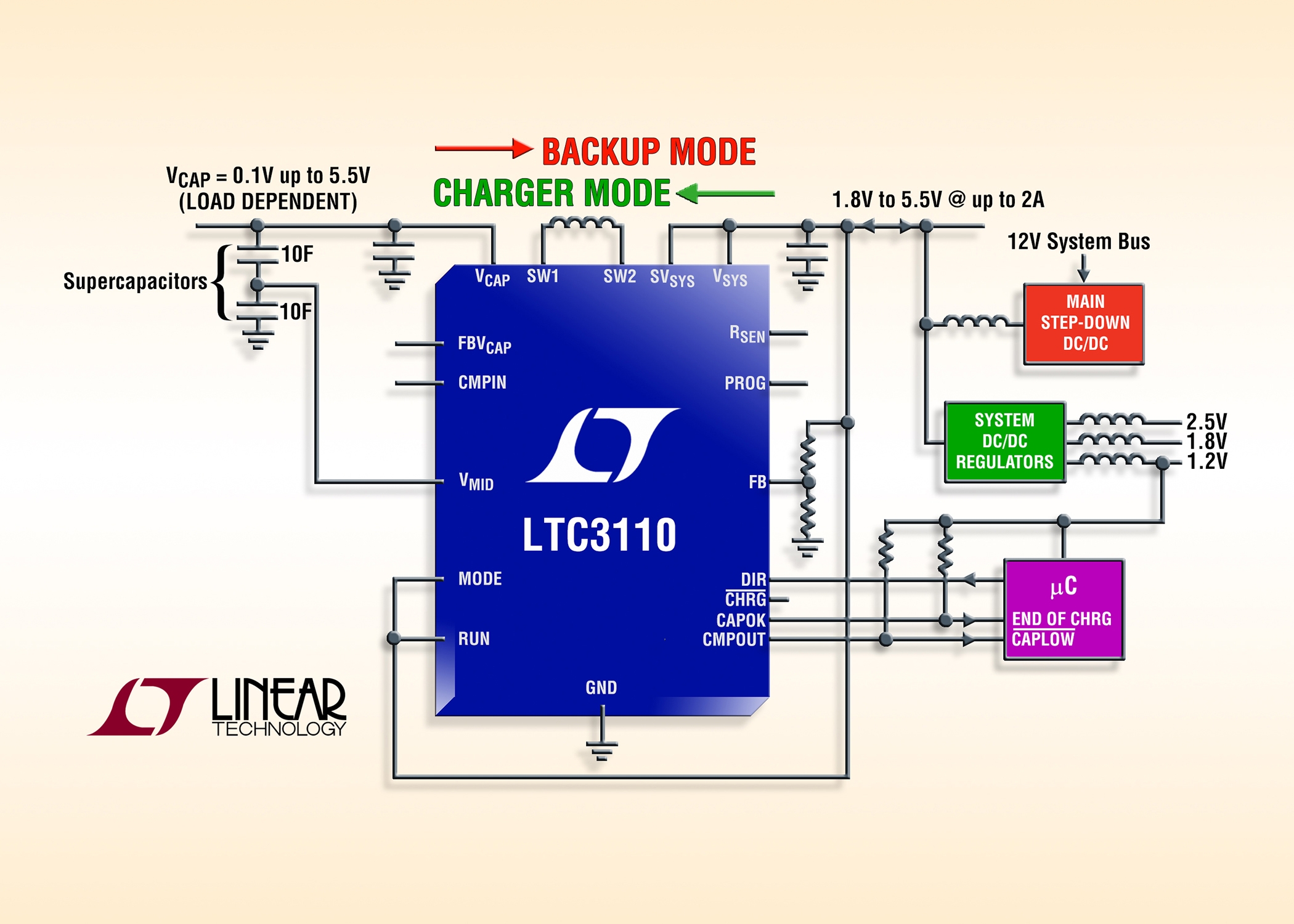 The LTC3110’s input current limit and maximum capacitor voltage is resistor programmable. Average input current is accurately controlled over a 0.125A to 2A programming range. Pin-selectable Burst Mode operation improves light-load efficiency and reduces standby current to only 40µA, and shutdown current to less than 1µA. Other features of the LTC3110 include high 1.2MHz switching frequency to minimize external component size, thermal overload protection, two voltage supervisors for direction control and end of charge, and one general purpose comparator with an open-collector output for interfacing with a microcontroller or microprocessor.