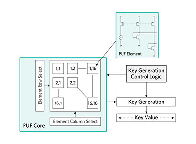 Also, due to the statistical nature of imperfect manufacturing techniques, there is no known method to discern any key information from inspection methods. Similarly, even knowledge of PUF element paring does not reveal any information about the key value that would ultimately be derived from the analogue characteristics of the PUF element structures. Finally, the PUF key value only exists digitally when a cryptographic operation is performed – thereafter, it is instantaneously erased. Combined, these attributes of this PUF design result in a solution that is highly immune to invasive attacks.