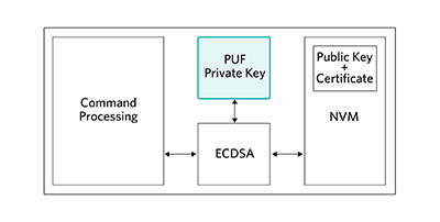 Numerous use cases exist for a PUF solution. Three are shown in Figure 4, Figure 5 and Figure 6. In Figure 4, to secure all stored data on a security IC, the PUF derived key is used to encrypt/decrypt data as needed using an algorithm such as AES. Any NVM data extracted from an invasive attack is useless given its encrypted state and inability to obtain the PUF-based decryption key. Figure 5 shows the use of PUF as the unique private key for ECDSA signing operations. For this case the device would compute its own public key from the PUF private key, and a certificate would be installed in NVM by a certificate authority prior to end-use deployment. In Figure 6, the PUF private key is the root private key for the security IC and is used in conjunction with the end system to establish a ‘root of trust’ with the security IC for subsequent services.
