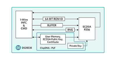 Maxim introduced its first PUF-based security IC, the DS28E38, in November 2017. The DS28E38 is an ECDSA authenticator that utilises the company’s ChipDNA PUF output as key content to cryptographically secure all device stored data. Optionally, under user control, ChipDNA is used as the private key for ECDSA signing operations. The device provides a core set of cryptographic tools derived from integrated blocks including asymmetric (ECC-P256) and symmetric (SHA-256) hardware engines, a FIPS/NIST-compliant true random number generator (TRNG), 2Kb of secured EEPROM, a decrement-only counter, and a unique 64-bit ROM identification number (ROM ID). The ECC public/private key capabilities operate from the NIST-defined P-256 curve to provide a FIPS 186-compliant ECDSA signature generation function. A block diagram of the DS28E38 is shown in Figure 7.