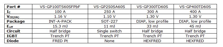 The half-bridge VS-GP100TS60SFPbF, VS-GP300TD60S, and VS-GP400TD60S combine Trench PT IGBTs with HEXFRED and FRED Pt anti-parallel diodes in the INT-A-PAK package and dual INT-A-PAK package with an extremely low profile of 17 mm. The single-switch VS-GP250SA60S features the SOT-227 package, provides very low stray inductance of ≤ 5 nH typical, and is UL-approved file E78996.