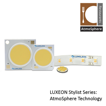 To create the ideal ambience for restaurants and other hospitality venues there is the lighting technology, LUXEON LEDs with AtmoSphere Technology, by Lumileds, to make customers feel cozy, comfortable and relaxed. AtmoSphere Technology can be used by lighting designers to cast a warm, inviting tone in restaurants and other hospitality settings, using single LUXEON LEDs or built-to-spec Matrix Platform light engines.