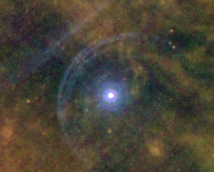 Infrared images taken of Betelgeuse in 2012 by Leen Decin of the University of Leuven in Belgium with the orbiting Herschel telescope show two shells of interacting matter on one side of Betelgeuse. Various interpretations exist; some say that this matter is a bow shock created as Betelgeuse’s atmosphere pushes through the interstellar medium as it races through the galaxy.