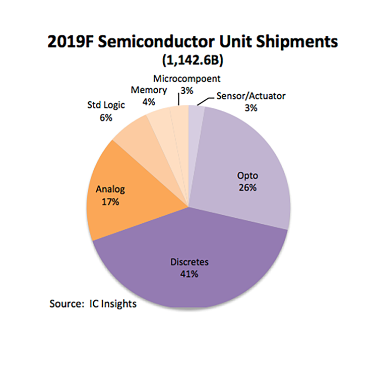 Annual semiconductor unit shipments, including integrated circuits and optoelectronics, sensors, and discrete (O-S-D) devices grew ten percent in 2018 and surpassed the one trillion unit mark for the first time, based on data presented in the new, 2019 edition of IC Insights’ McClean Report—A Complete Analysis and Forecast of the Integrated Circuit Industry.