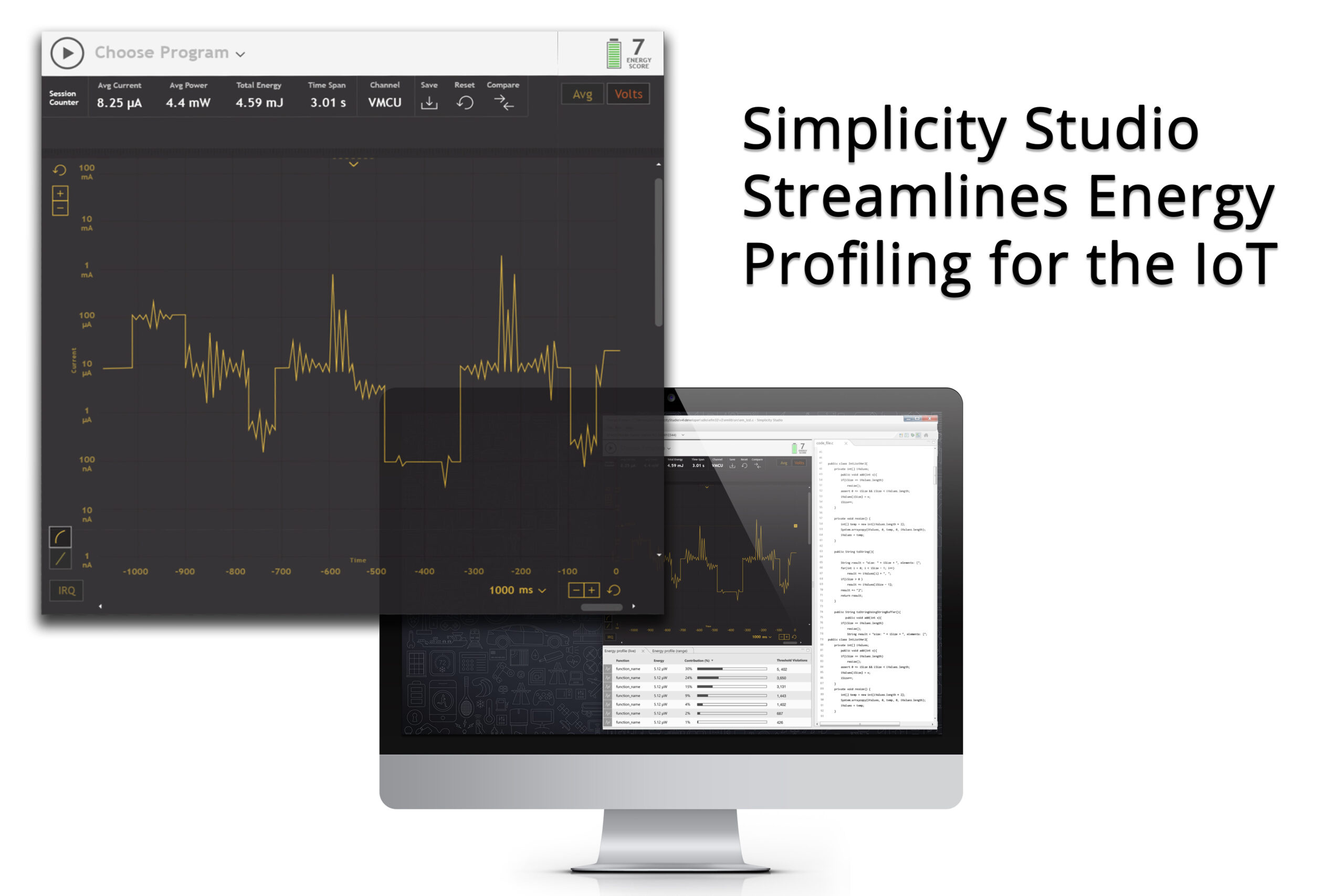 The Energy Profiler features an enhanced energy graphing capability that has the familiar look and feel of an oscilloscope. The developer can now zoom in on the X (time) and Y (power) axes of the energy graph to analyze the details of energy consumption with greater precision. In addition, the profiler provides a direct correlation between the energy graph, function analyzer and application code. This three-way correlation capability enhances the developer’s ability to optimize designs for ultra-low energy consumption.