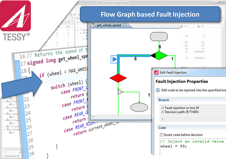 In TESSY 4.1, however, fault injection is automated and does not remain in the source program. The error injections are defined directly in the flow chart of the function within the TESSY environment.