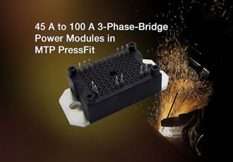 Vishay Intertechnology introduced a new series of 45 A to 100 A three-phase-bridge power modules in the low-profile MTP PressFit package. Compared to devices incorporating solder contact technology, the VS-40MT160P-P, VS-70MT160P-P, and VS-100MT160P-P dramatically lower production costs and increase reliability for welding machines, UPS, switch mode power supplies,